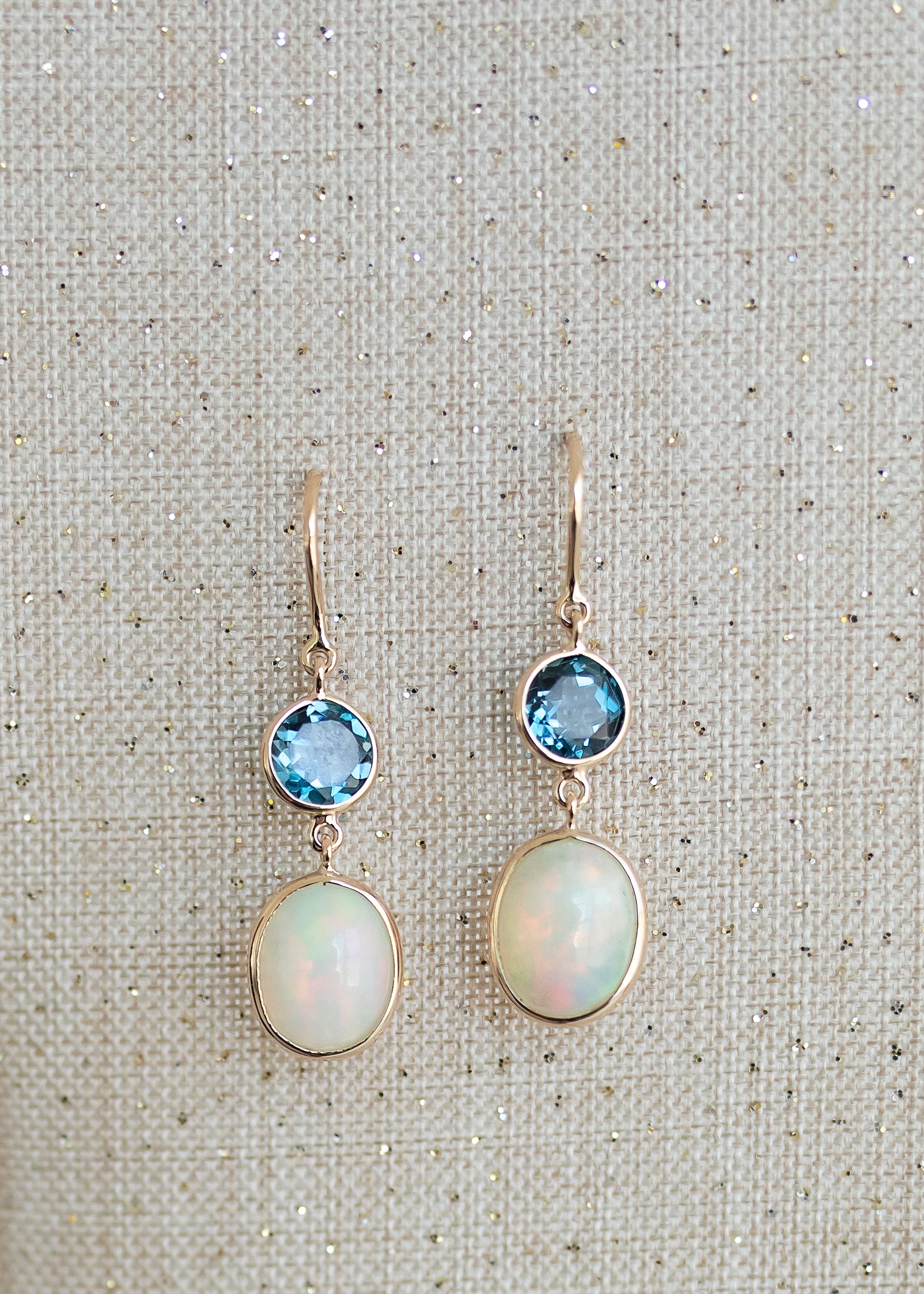 Illuminate your look with the Celestial Duo earrings, a stunning blend of London blue topaz and sparkling opal natural gemstone that evoke the beauty of a starlit sky. Each London blue topaz radiates a rich, velvety blue, perfectly complemented by the brilliance of white opal gems that catch and reflect the light with every movement. Crafted to exude elegance and sophistication in 14k solid gold, these earrings offer a timeless style that transitions effortlessly from day to night. The Celestial Duo earrings are a perfect harmony of colorful gems and sparkle, adding a touch of celestial beauty to any ensemble.