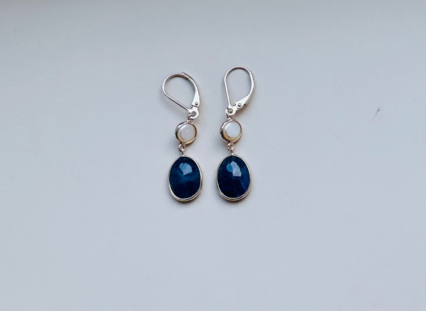 A stunning union of elegance and depth, these hanging earrings feature brilliant blue sapphires paired with lustrous pearls. The deep, velvety hue of the sapphires contrasts beautifully with the soft glow of the pearls, all set in refined sterling silver to create a timeless and regal accessory, perfect for evening wear or formal occasions.