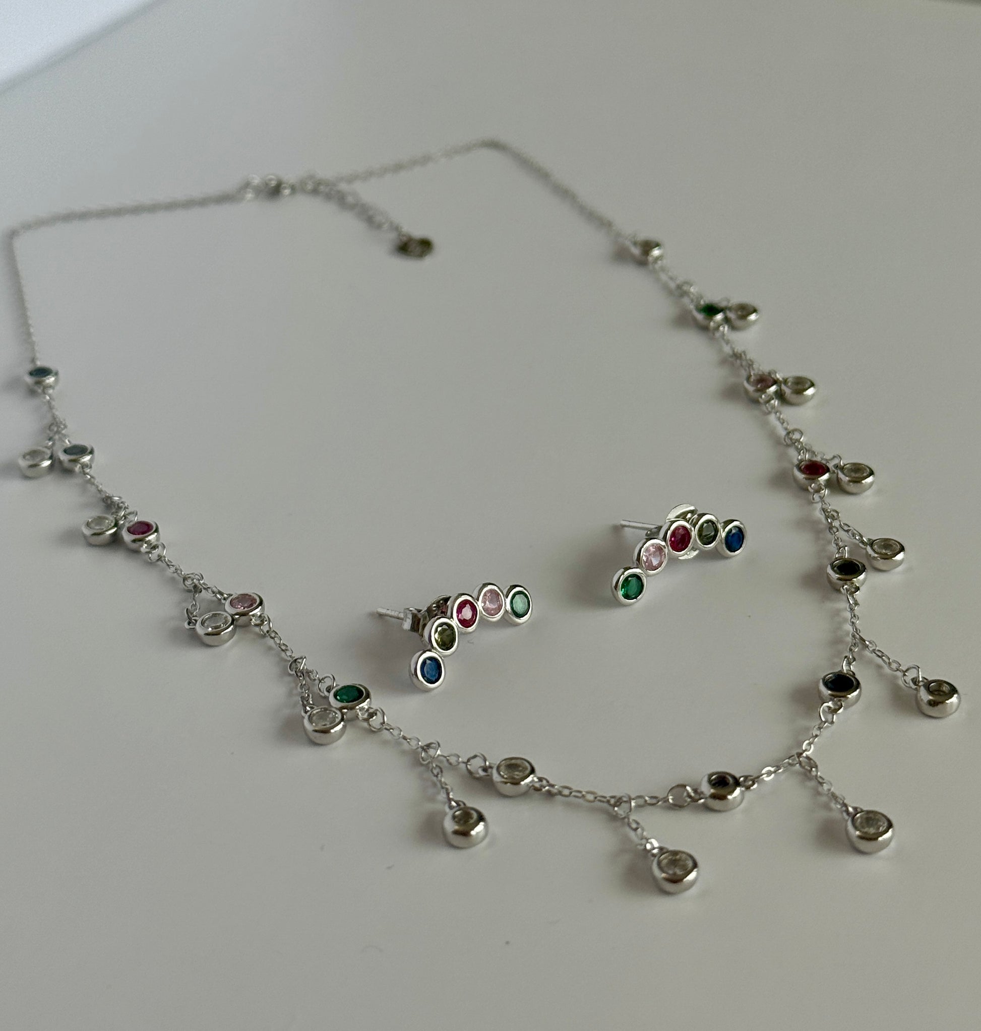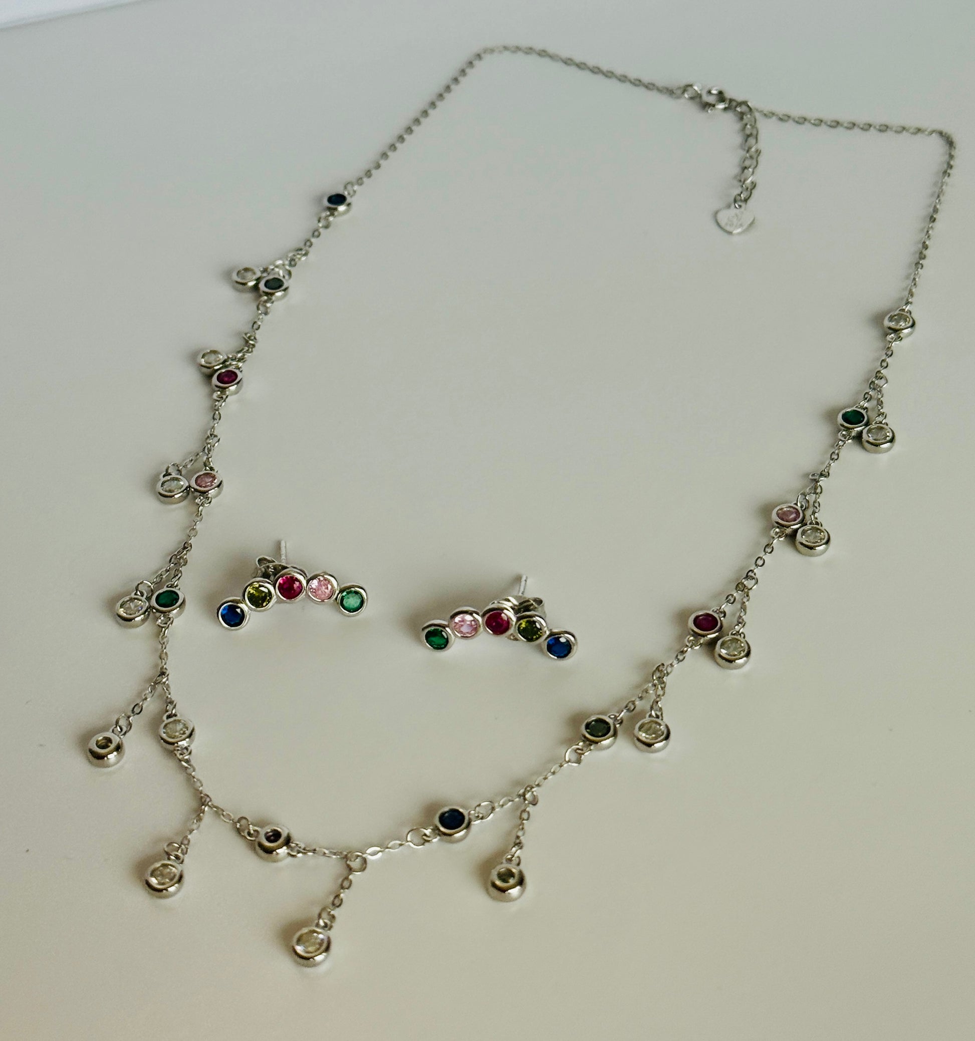 Celebrate color and elegance with the Graceful Spectrum Set, a stunning jewelry collection featuring a necklace, bracelet, and earrings adorned with natural multi-gemstones. Handcrafted in sterling silver, each piece is designed to highlight the unique beauty and vibrancy of every stone, creating a harmonious and eye-catching ensemble.